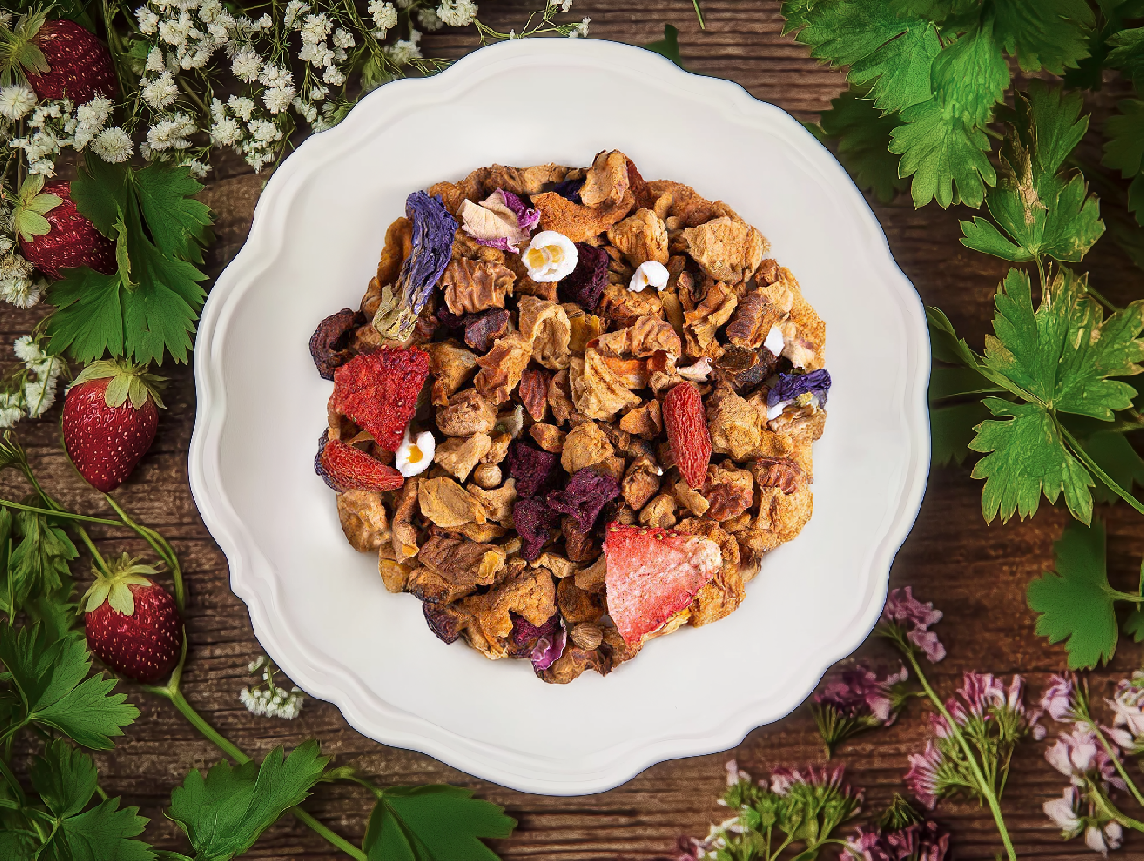 🍃 Komplexní profil Přirozená jahodová aroma v kombinaci s kousky skutečných jahod vytváří autentickou bobulovou sladkost, která tančí na patře. Jemné růžové okvětní lístky přidávají květinovou eleganci, zatímco překvapivé prvky jako popcorn přispívají jedinečné, hravé textuře a nádechu ořechavosti. Přidané květy marshmallows nejen poskytují vizuální kouzlo, ale také dodávají hladký, sametový pocit v ústech nálevu.
