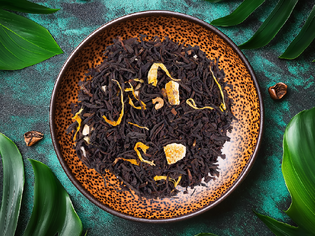 Genießen Sie diese luxuriöse Schwarztee-Infusion, die süße Ananas mit reichhaltigen, buttrigen Karamell-Noten kombiniert. Eine Spur von Orange und Ringelblumenblüten verleihen diesem tropischen Dessert einen frischen, goldenen Hauch.