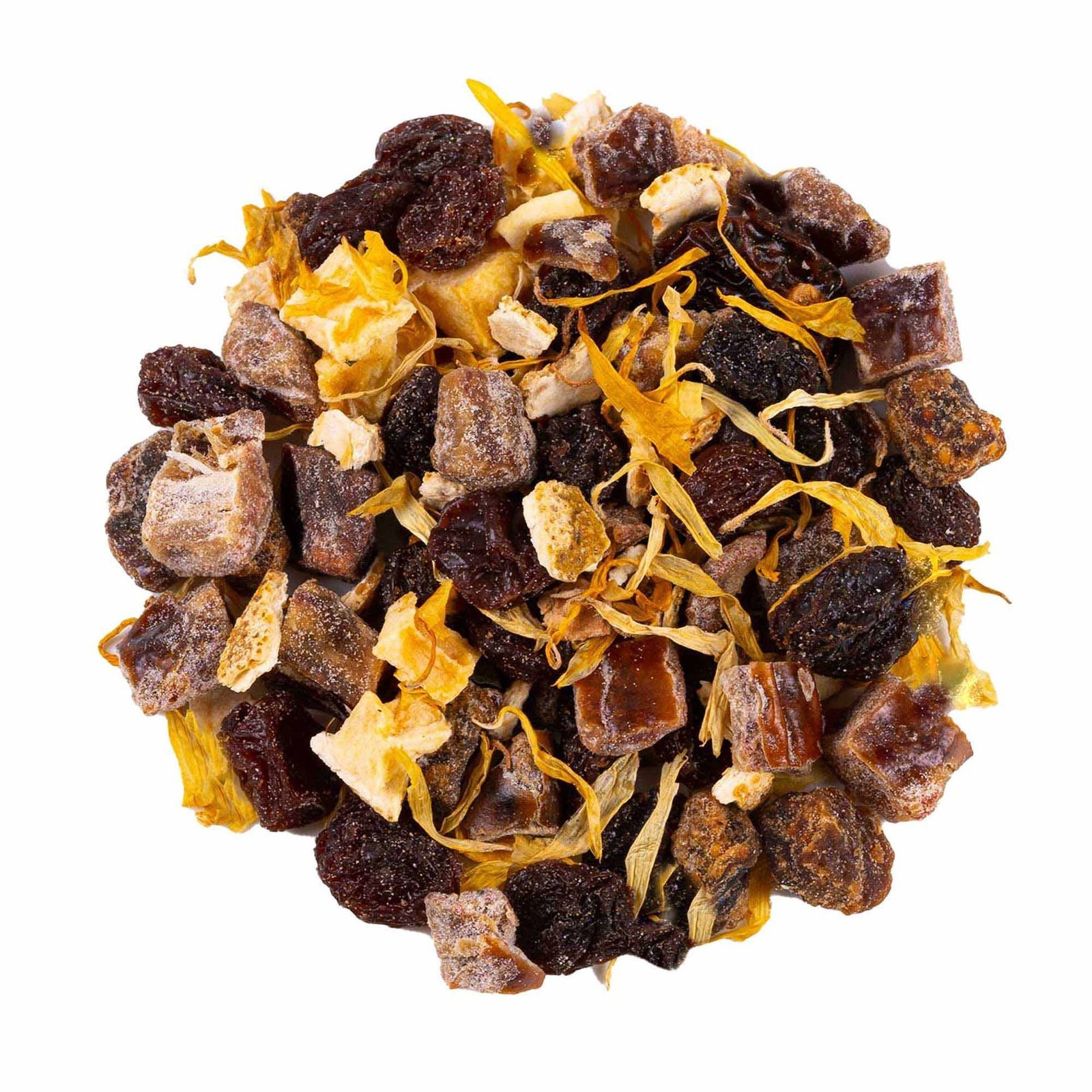 Eine reichhaltige und delikate Fruchtmischung, bei der die natürliche Süße von Feigen und Datteln mit exotischen Noten von Mango und Physalis harmoniert, sanft erfrischt durch Orangenschale und Ringelblumenblüten. Goldene Feige ist ein luxuriöser Tee mit natürlicher Aromatisierung, der einen goldenen Sonnenuntergang in einer Tasse evoziert.