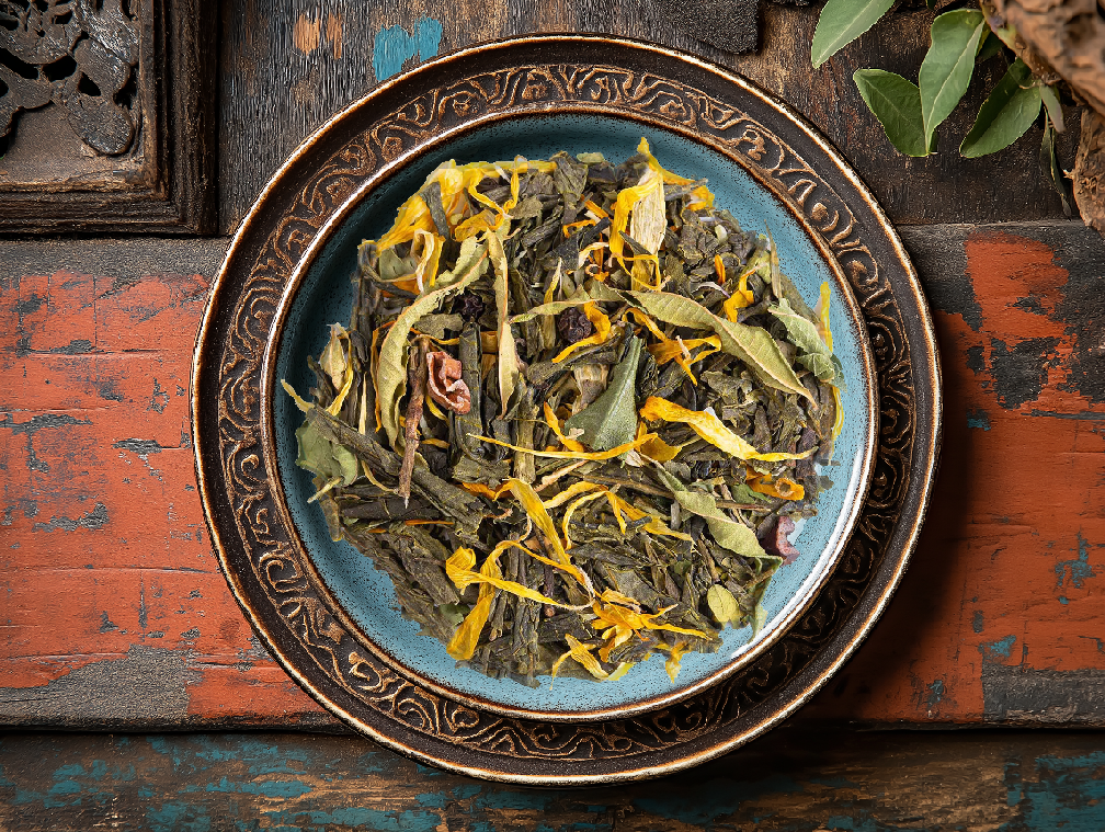 Grüner Tee China Sencha, Kakaobohnen, Kokosnuss (5 %), natürliches Aroma, ganze Verbena, Ringelblume, schwarzer Pfeffer, Moringa-Blätter.