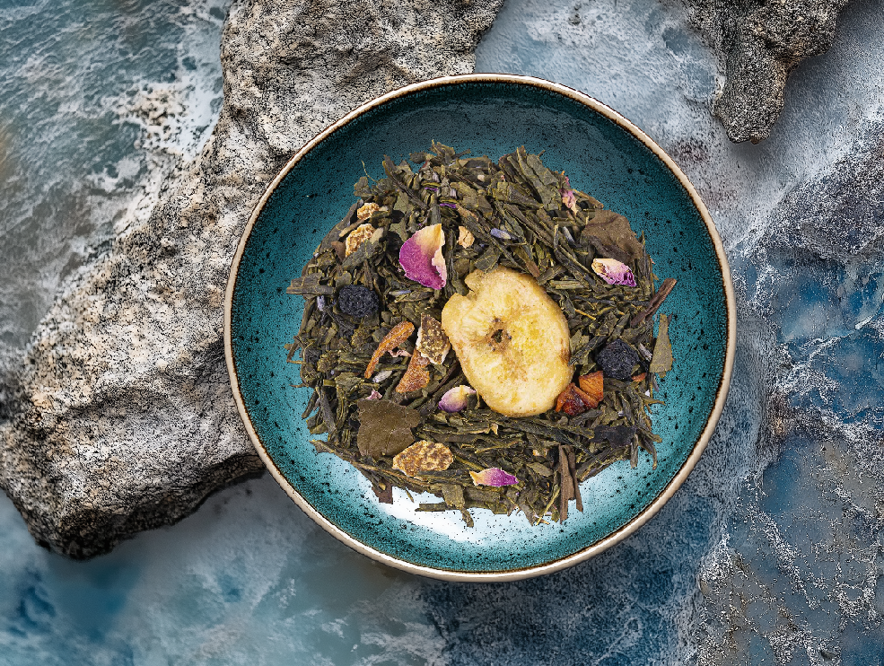 Green tea China Sencha, banana (banana, coconut oil, cane sugar, honey), natural flavor, pieces of mango, papaya, orange peel, chokeberry, White tea Pai Mu Tan, lavender, rose petals, mango, Chinese Jasmine Silverneedle, vanilla.
