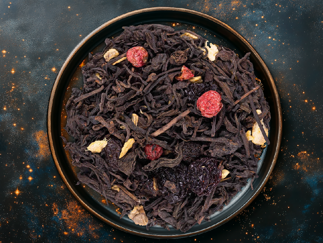 Čaj Pu Erh China, Černý čaj Assam, Jižní Indie, zázvor, hrozny (hrozny, rostlinný olej), višně, přírodní aroma, červený rybíz.
